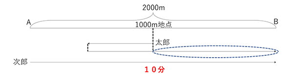 太郎は、図の青色の点線の部分を1000÷250=4分で進むので、出発してから向きを変えるまでの時間が(10-4)÷2=3分ということになり、ここから距離を求めれば答えが求まります。